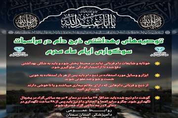 اینفوگرافیک توصیه های بهداشتی ذبح دام در ایام محرم 1404/04/11 - 06:48 - تعداد بازدید: 15 - کد خبر : 342900 - گروه خبری : گروه های مطالب,اطلاعیه,هشدارهای بهداشتی - تعداد نظرات : 0